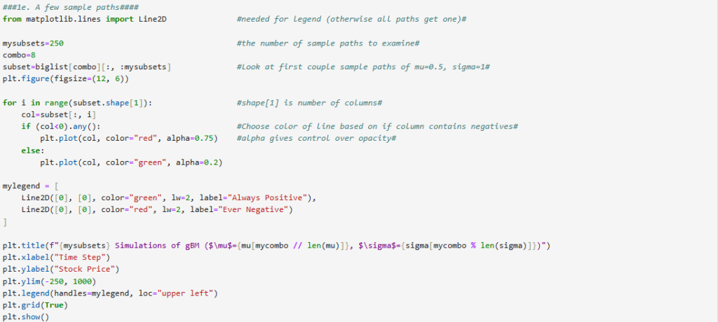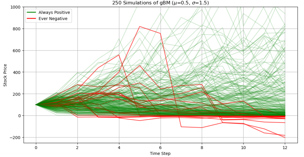 Before embarking on our simulation, we’d like to ascertain certain properties of \(S_t\). In particular, we want to know \(\mathbb{P}(S_t < 0 | S_s > 0)\) for any fixed \(0 \leq s < t \leq T\); we want the probability the brownian motion goes negative in finite time given that it is positive at a certain point. By Ito’s Lemma, the analytic solution to the Geometric Brownian Motion is \(S_t=S_0 \exp{\left[\left(\mu-\frac{\sigma^2}{2}\right)t+\sigma(W_t-W_o)\right]}\) (and so \(S_t=S_s \exp{\left[\left(\mu-\frac{\sigma^2}{2}\right)(t-s)+\sigma(W_t-W_s)\right]}\)). Since the exponential term is always positive, and since we are conditioning on \(S_s > 0\), it is clear that \(\mathbb{P}(S_t < 0 | S_s > 0) = 0\) regardless of the specific values of \(s\) and \(t\).